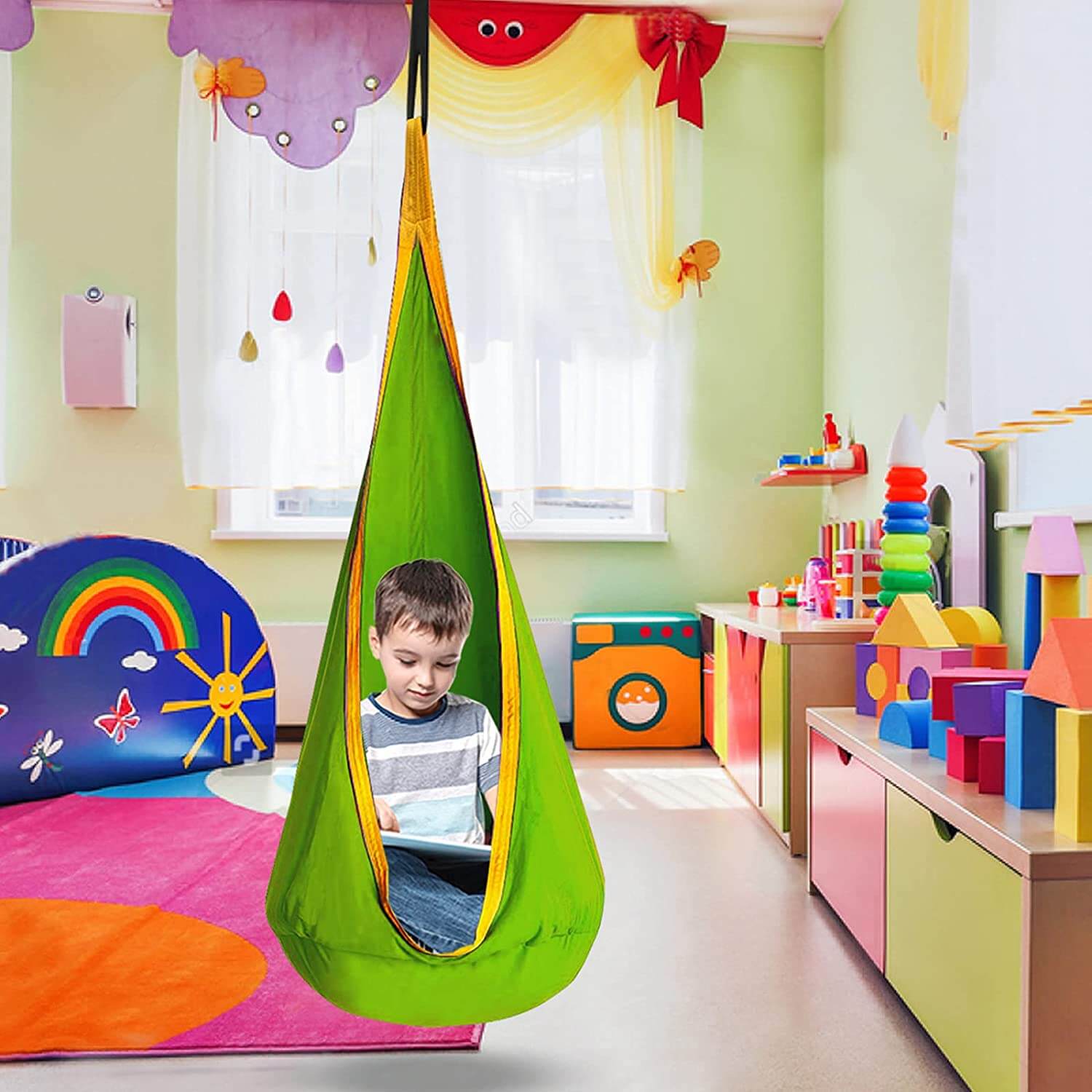 Our kids pod swing seat is made of 100% cotton canvas material, which is comfortable, breathable, and has no peculiar smell. The double-layered thickened nylon edge makes it stronger and more secure for children. The inflatable pillow ensures that the swing is stable and comfortable. This item can support up to 220 pounds, providing a safe and comfortable reading space for children.